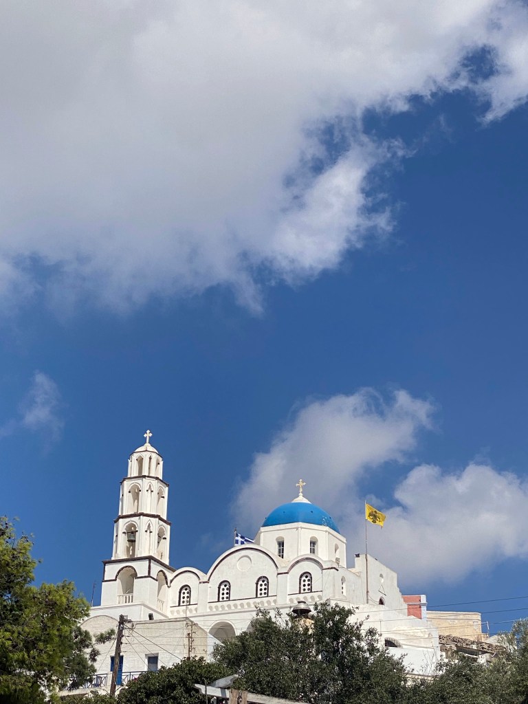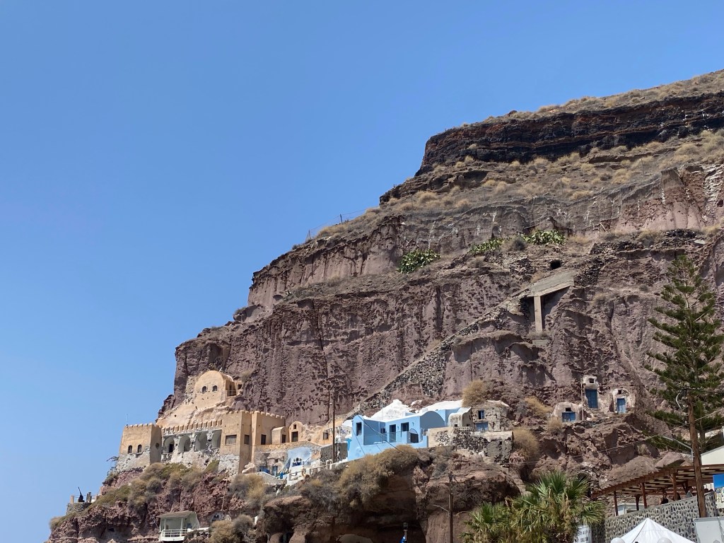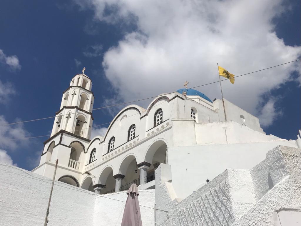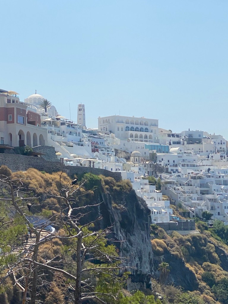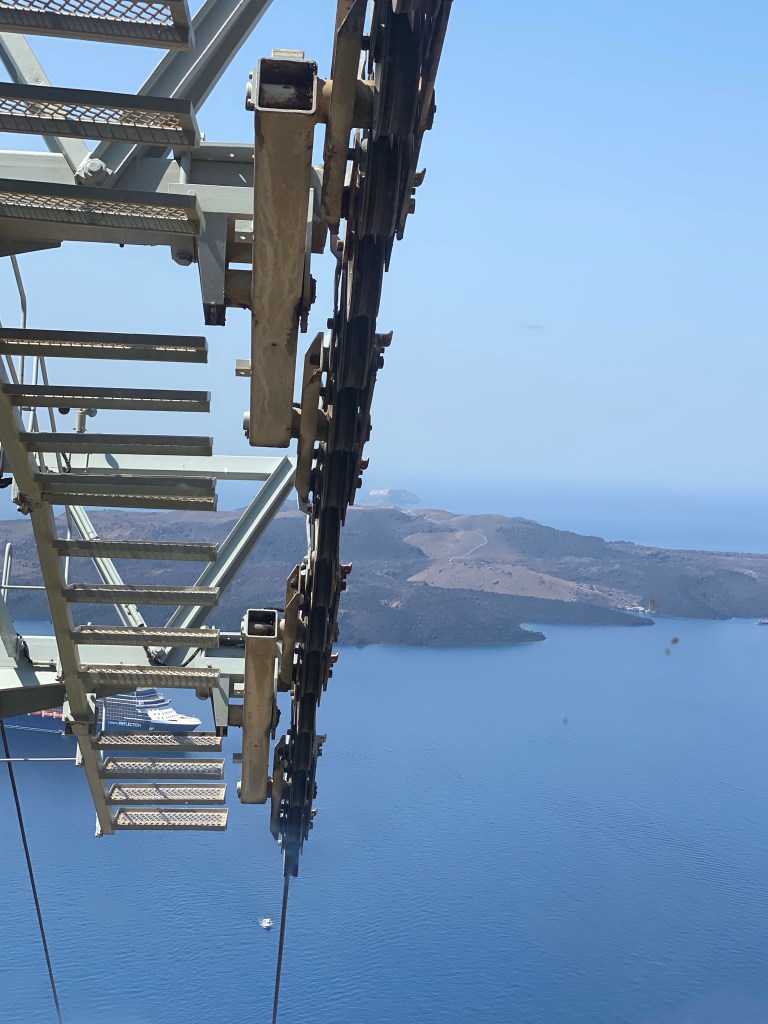 en met de kabelbaan naar beneden in Fira