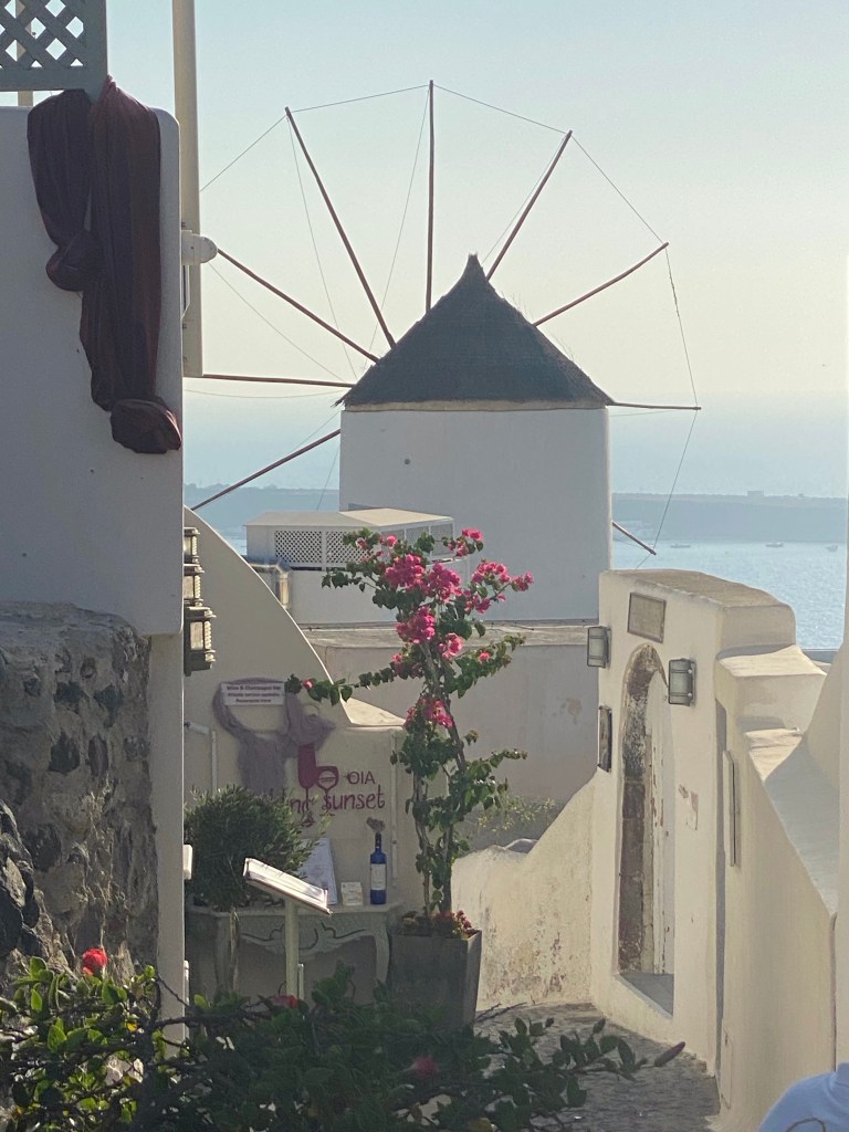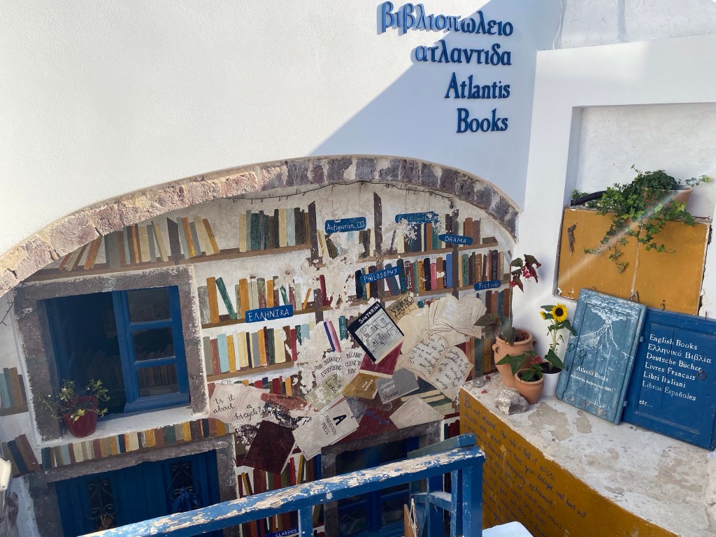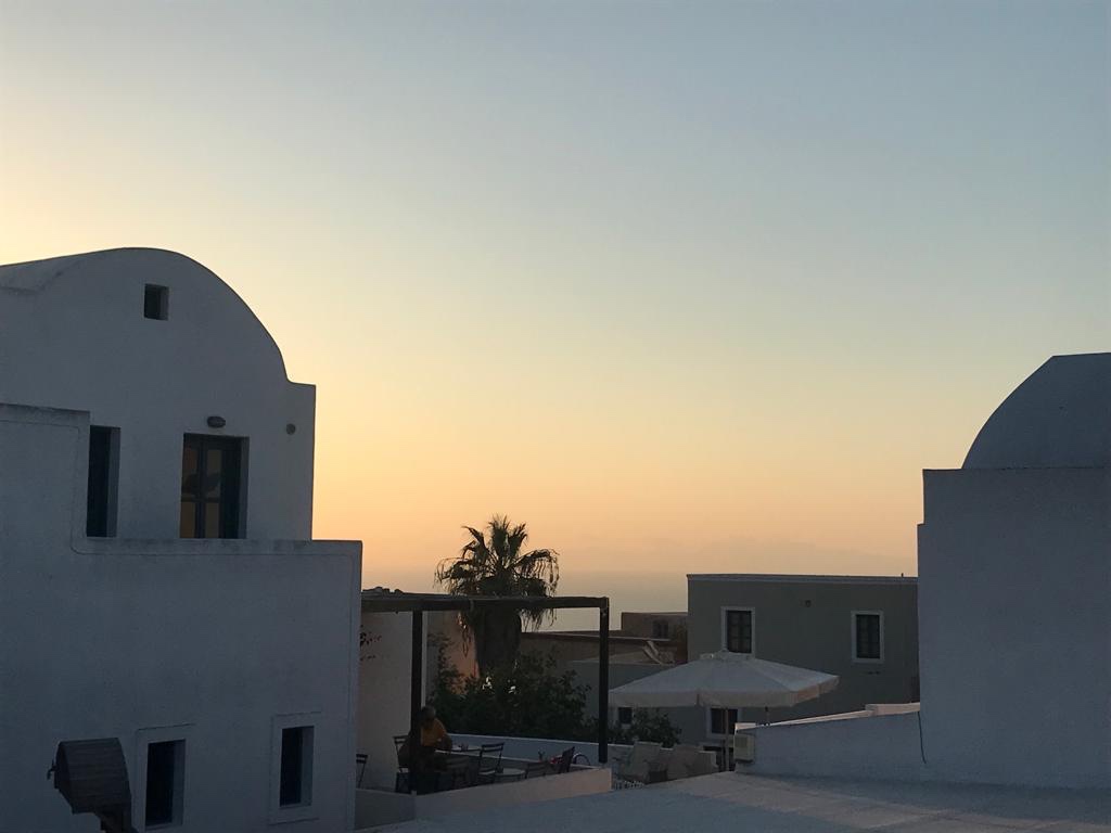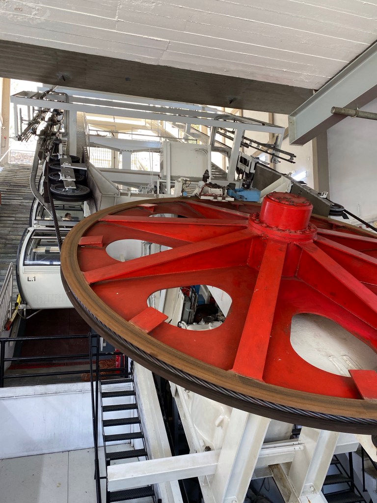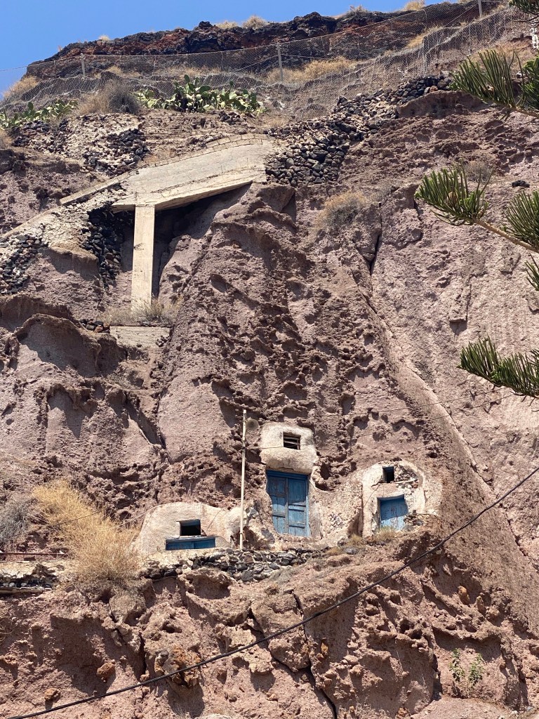 en met de kabelbaan naar beneden in Fira